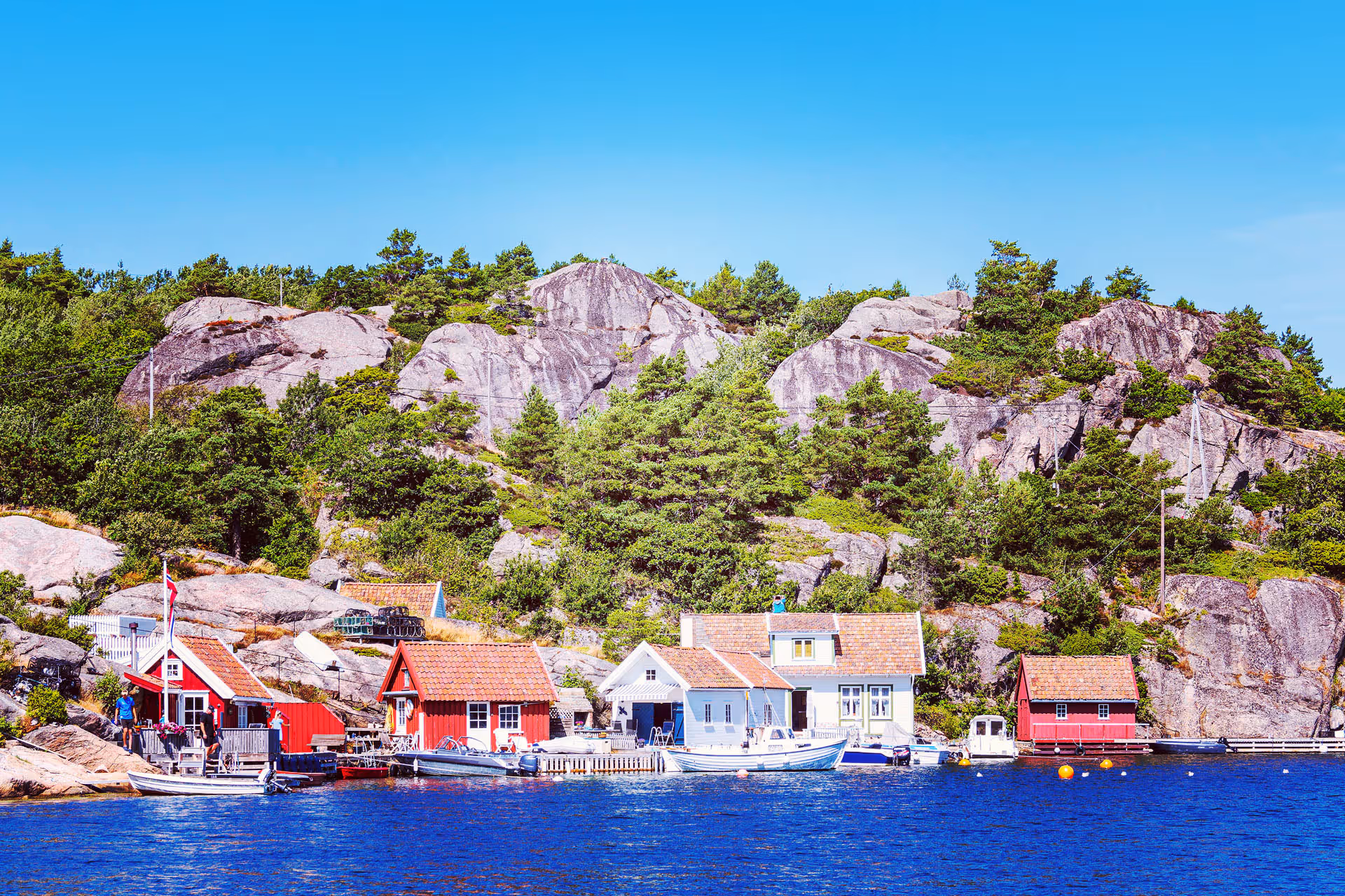 Utsyn til hvitmalte trehus, fyr, smale sund og stille fjorder – et landskap unikt for Norge